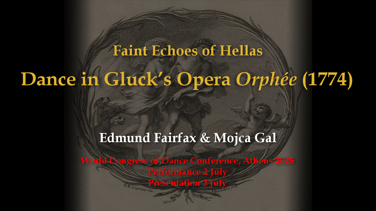 This presentation provides an introduction to various aspects of late eighteenth-century ballet, using the 1774 Paris Opéra production of Gluck’s opera Orphée et Eurydice as a case study. Discussed are the concept of the French operatic dance divertissement; the basic character of ballet at this time, including both technical and stylistic features; some common choreographic conventions; the choices of music to be used as dance accompaniment; and specifically the nature of the dances in the divertissements to Gluck’s opera, as far as they can be reconstructed. To complement this lecture, a historically informed two-part extended solo is also being presented separately. Lecture material by Edmund Fairfax, presented by Mojca Gal (3 July).