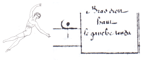 Fig. 8. Left (Blasis 1820: pl. 13, fig. 3); right: notational character defined as “bras droit haut le gauche tendu” ‘right arm high, the left extended’ (Saint-Léon 1852: “Tableau Général”).