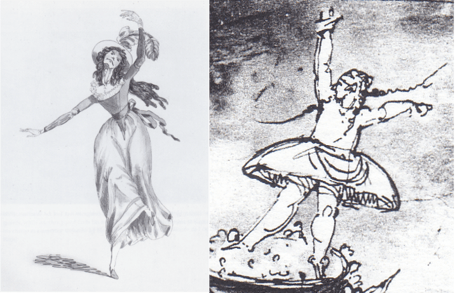 Fig. 12. Left: a caricature of Marie-Madeleine Guimard entitled “The Celebrated Madelmoiselle G-m-rd or Grimhard of Paris,” London 1789, unknown artist, reproduced in Guest (1996: pl. 38); right: a detail from “la naissance du Danseur, le Maître de Ballet Gallodier” (‘the birth of the dancer, the ballet master [Louis] Gallodier’ (c. 1734-1803)), sketch by Johan Tobias Sergel, reproduced in Skeaping (1967: 52).