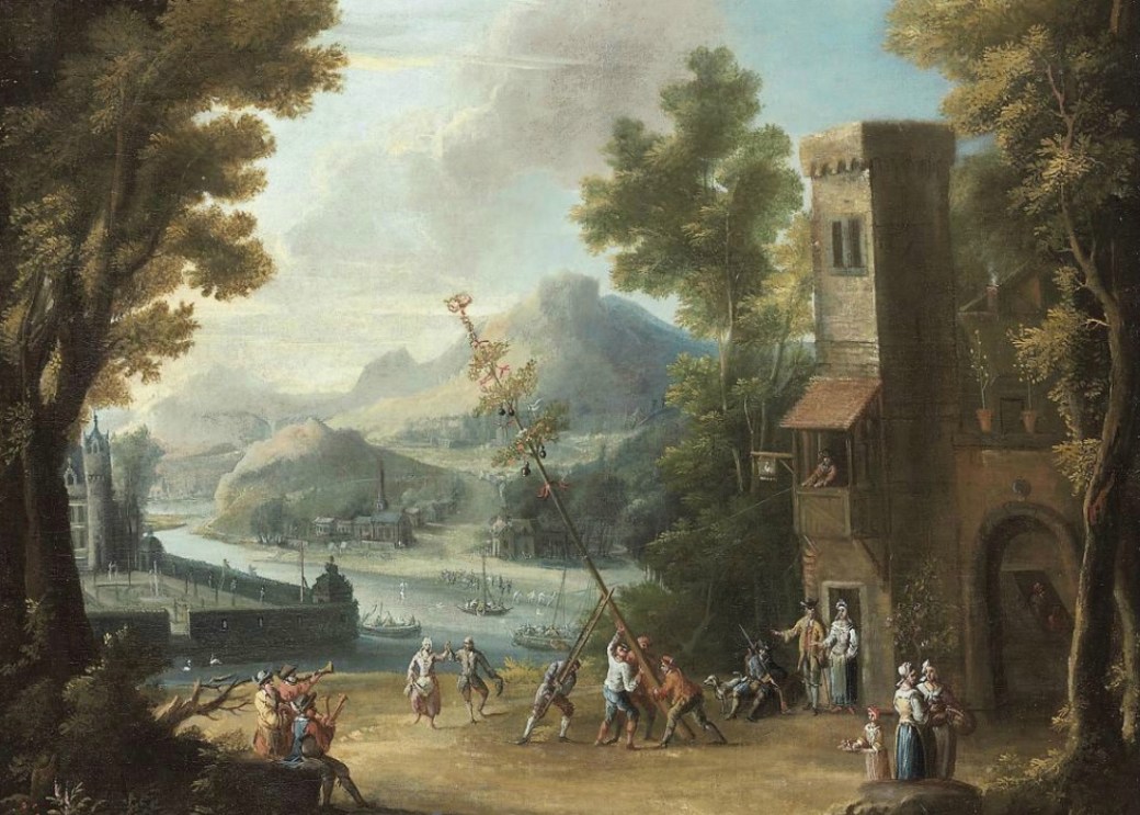 Plusieurs garçons du Village arrivent avec un troupe de symphonistes à leur tête, ils portent le mai, le plantent en face de la maison, & au bruit des instrumens qui les accompagnent. (‘A number of village lads come on led by a group of musicians. They carry the maypole, which they set up in front of the house, to the sound of the instruments which accompany them.’)