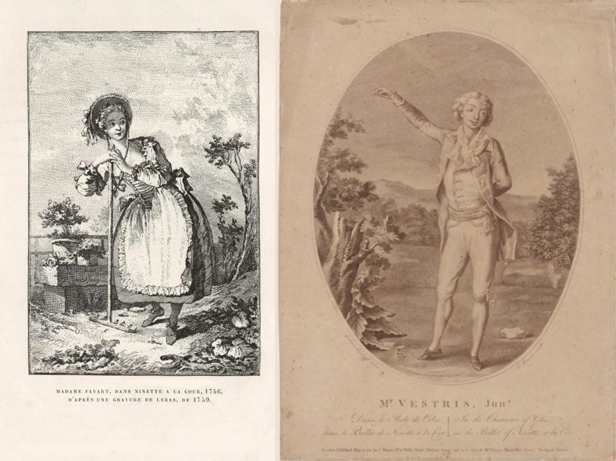Left: the singer-actress Madame Favart as Ninette in Favart’s opera (1759); right: the dancer Auguste Vestris as Colas in Gardel’s ballet (1781).