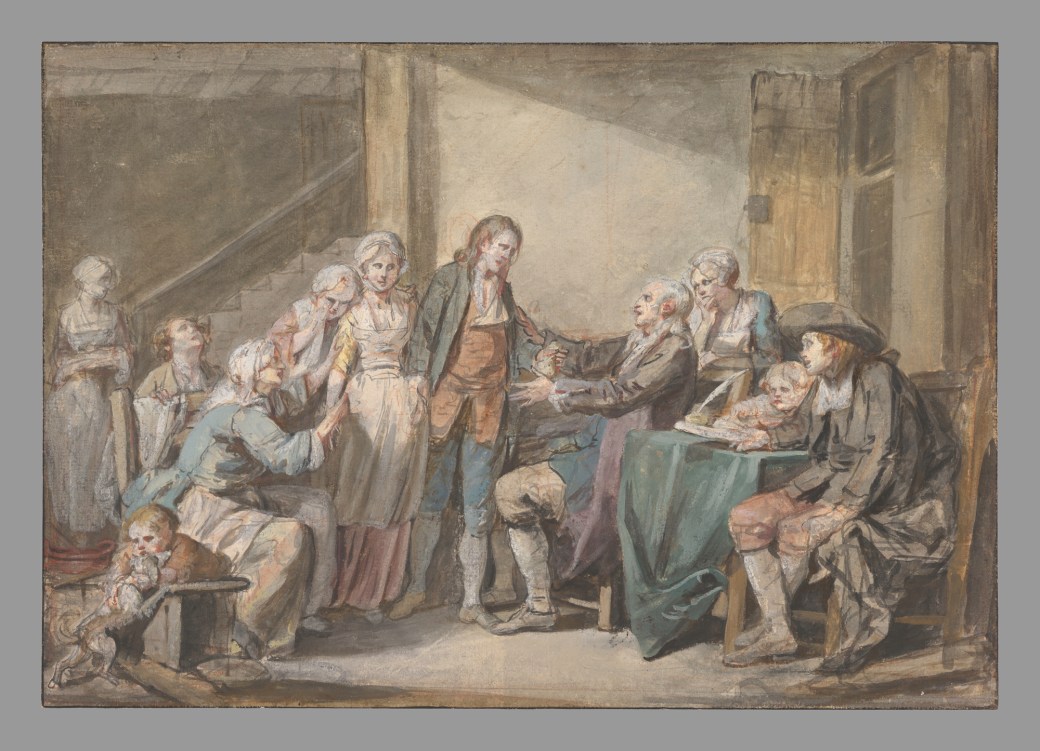 Jean-Baptiste Greuze’s L’accordée de village (c1761), showing on the extreme right a notary and to his left a clerk drawing up a marriage contract. A review of Gardel’s ballet disapproved of “one of the notary’s clerks who presents his back as a desk” in this scene (JP 30 Aug. 1778: 967).
