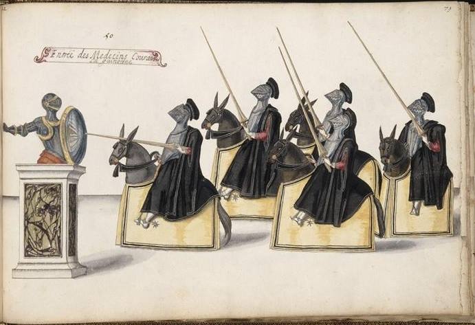 A scene from an early 17C theatrical piece showing the use of hobby-horse costumes. An invoice in the archives of the Opéra specifies that the “horses” in Gardel’s Ninette were made “with life-like heads and bodies large enough to contain a man inside,” in other words, hobby-horse costumes along the lines of those shown above. There were eight of them in all, and also a full-sized wicker stag complete with antlers.