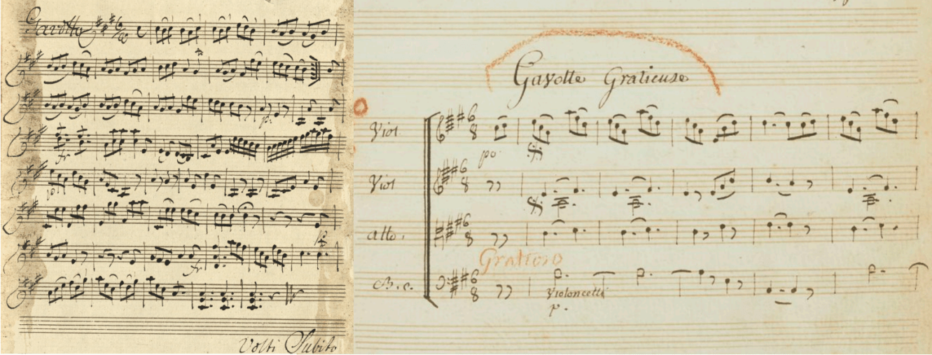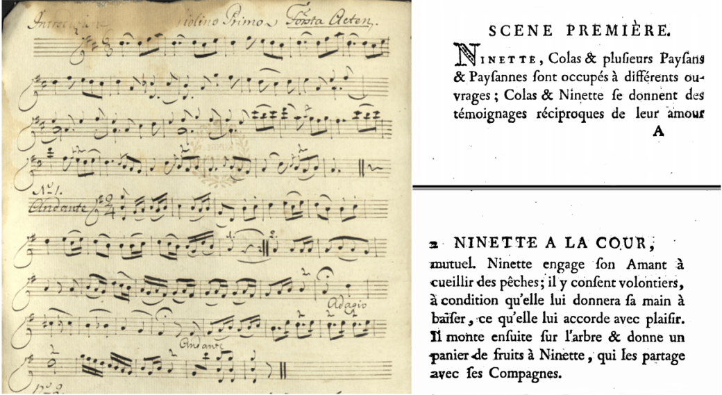The opening scene of Gardel’s Ninette à la cour: left, the first violin part in the Stockholm version; right, the scene summary (1777).