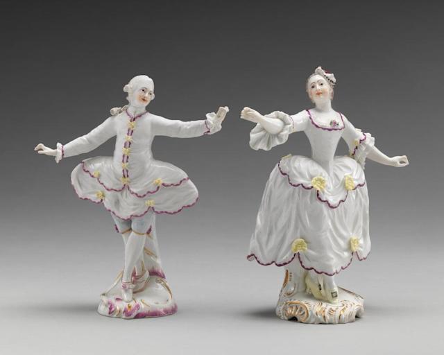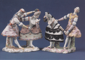 Two porcelain figurines (Höchst 1758) representing theatrical dancers, specifically in small poses (as shown by the lack of turnout and the fanciful arrangement of the arms). The male dancer wears a tonnelet, a kind of male tutu, typical of dancers in the serious style, which was mainly a slow terre-à-terre genre. The woman is shown in street shoes rather than dance shoes (for a discussion of 18C dance shoes, click here). Extant dances in notation indicate that 18C pas de deux were strongly characterized by mirror-image symmetry, as shown here.