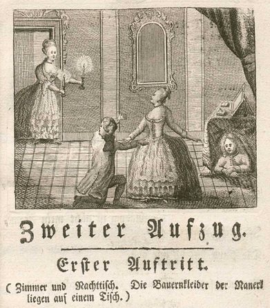 Ninette coming in with candlesticks, while the king is on bended knee before the countess and Colas is under the table, illustration from a 1778 German translation of Favart’s libretto.