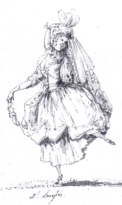 A costume design for the Opéra dancer Langlois in the opera Alcindor (1787), showing a veil attached to the headdress. Something similar was presumably worn by Ninette.