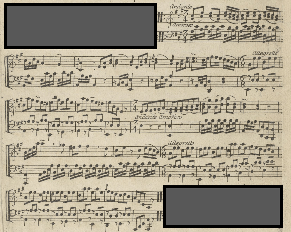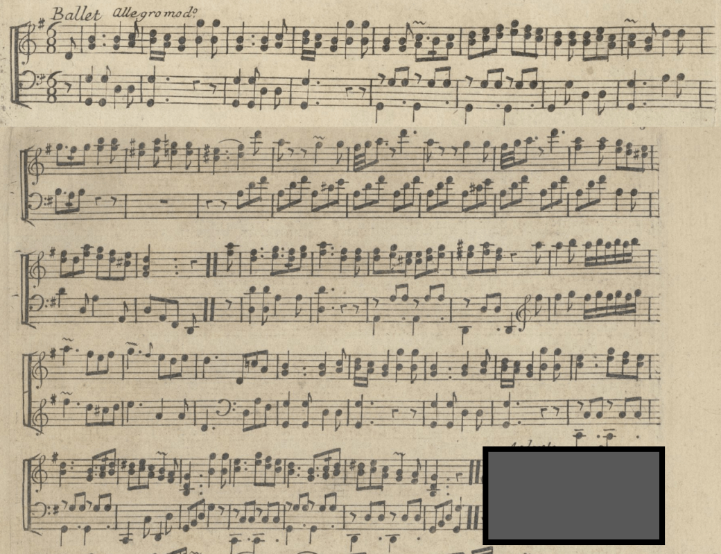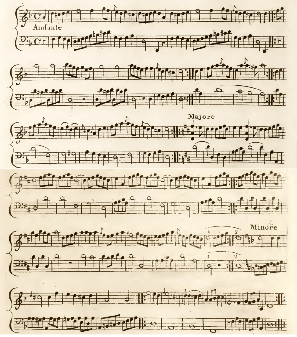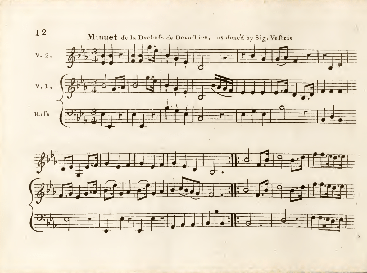 The 1781 London production at the King’s Theatre, mounted by G. Vestris, presumably used the same music as found in the Paris version. In the some of the performances during the run, a dance to the music The Devonshire Minuet was inserted. The dance may have been placed here, as a kind of adjunct to the duet, or as a replacement of it. Noferi (1781) published a reduction of the music, which is given here: