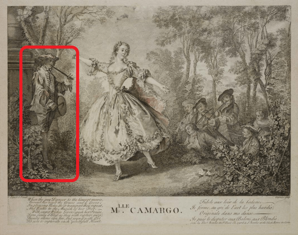 A tambourin was a characteristic piece of music intended to evoke the music of the folk-instrument combo the tambourin (drum) and galoubet (whistle). At the time of Ninette‘s premiere, the Paris Opéra orchestra included a musician who played the tambourin. The famed dancer Camargo excelled in dancing tambourins, according to Noverre, and Lancret’s portrait of her (above) shows her dancing to the folk instruments.