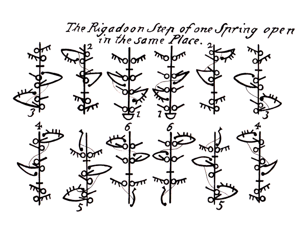 This is a tentative draft of chapter 23 “The Pas de Rigaudon” from the work in progress The Technique of Eighteenth-Century Ballet (© Edmund Fairfax 2018). Some technical aspects of the step, which are of a more general nature, are discussed in detail in other chapters, and the reader would simply consult those sections in a completed work, but these are not available here at the present time. To sidestep the high fees demanded by institutions and publishers for the use of copyrighted images, I use careful tracings of original illustrations instead, with irrelevant detail from background, costume, etc. omitted when desirable, and these tracings are presented below. In some cases, originals are given below temporarily until tracings can be furnished. In conformity with a convention from historical linguistics, a star is placed in front of a non-attested name or expression, e.g., *pas de rigaudon battu.