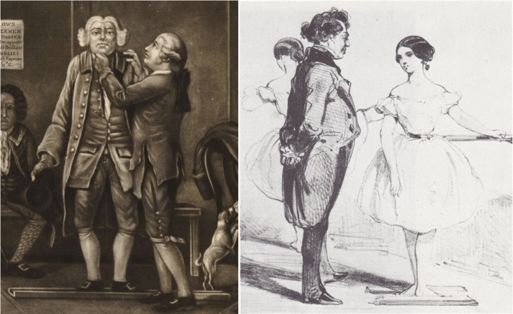 Fig. 5. Left: detail from Grown Gentlemen Taught to Dance by J. Goldar after the painting by John Collett, 1767; right: “here’s an odd notion to invent a machine to maintain fourth position. My dear child, in order to succeed, first a dancer must break her legs,” from a lithograph c. 1845.