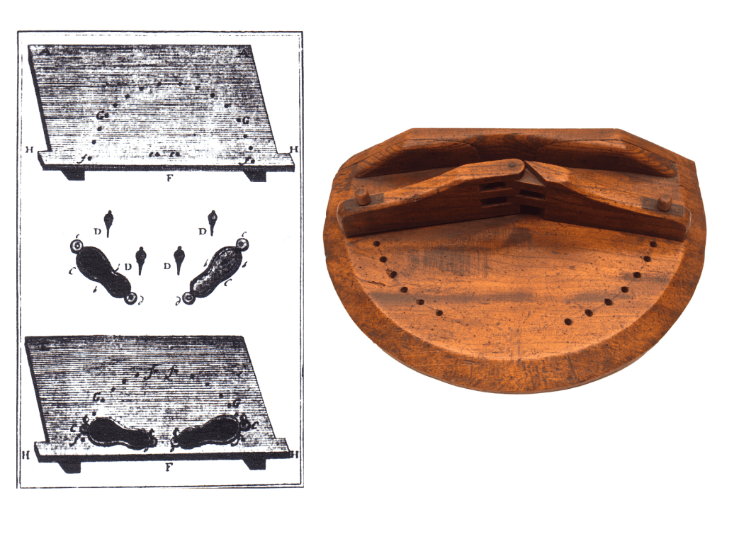 This [fig. 4, right] was a round wooden disk with a diameter of two feet, upon which lay two small boards, the length and breadth of a foot, fitted out with two edge-guides movable on a dowel in the middle of the disk in order to be placed in the direction that they were to be held by a peg extended to the fore. On these two boards the pupil was placed, and the feet were forced out more and more by the position of the boards until a diametrical line was reached along which the poor student often had to stand for a long time.