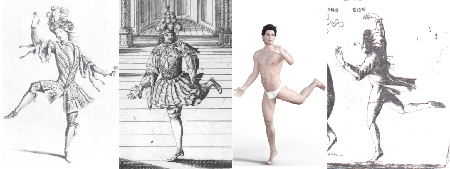 Fig. 8. Left: a late-seventeenth- or early-eighteenth-century dancer, reproduced in Kirstein (1984: 64); second from left: a dancer in the role of a Roman, an engraving by Johann Georg Puschner (Lambranzi 1716: 1/21); third from left: a reconstruction of the Roman directly to the left; right: detail of Auguste Vestris, 1781, an engraving by Sandby “Bass Relief Found at the Opera House,” in the Toronto Reference Library, Canada.